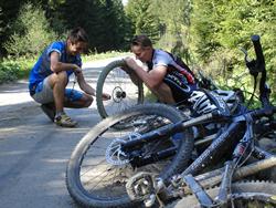 cœur de voir ça 1ere crevaison dans la bonne humeur, au frais a l’ombre, juste avant la dernière montée…